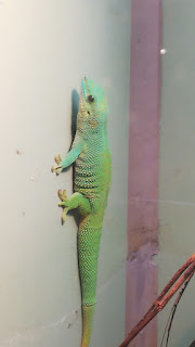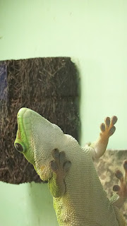 マダガスカルミドリヤモリの前を通ったら、ガラスにピタッとひっついていました!